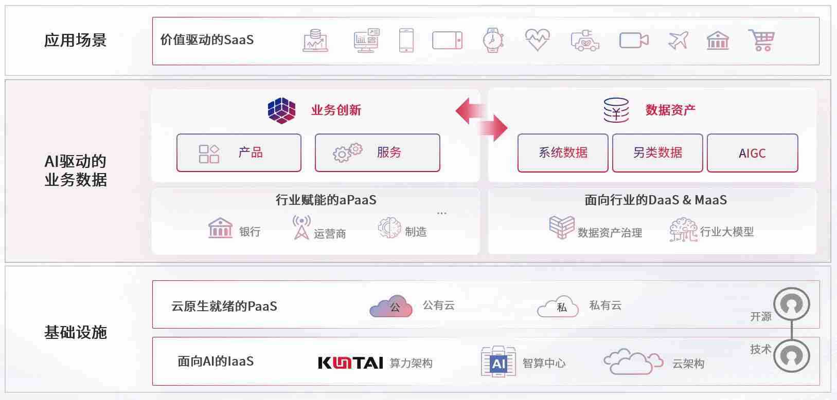 数字时代,,,,围绕企业数字化转型的关键要素,,,,太阳成集团tyc151cc数码开创性的提出数云融合战略和技术体系框架,,着力在云原生、、数字原生、、、AI原生和信创产业上架构产品和服务能力,,,,为处在不同数字化转型阶段的快消零售、、汽车、、、金融、、、医疗、、政企、、教育、、、运营商等行业客户提供泛在的敏捷IT能力和融合的数据驱动能力,,构建跨界融合创新的数字业务场景和新业务模式,,,,助力企业级客户建立面向未来的核心能力和竞争优势,,全面推动社会的数字化、、智能化转型升级。。